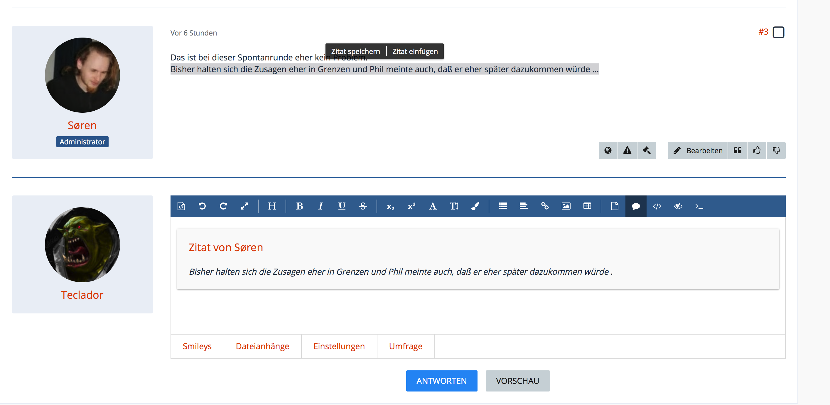 Zitieren: Markiert einen beliebigen Text einer anderen Person, diesen könnt Ihr dann als Zitat in Euren Beitrag einfügen, sodass immer die Zusammenhänge zu erkennen sind.